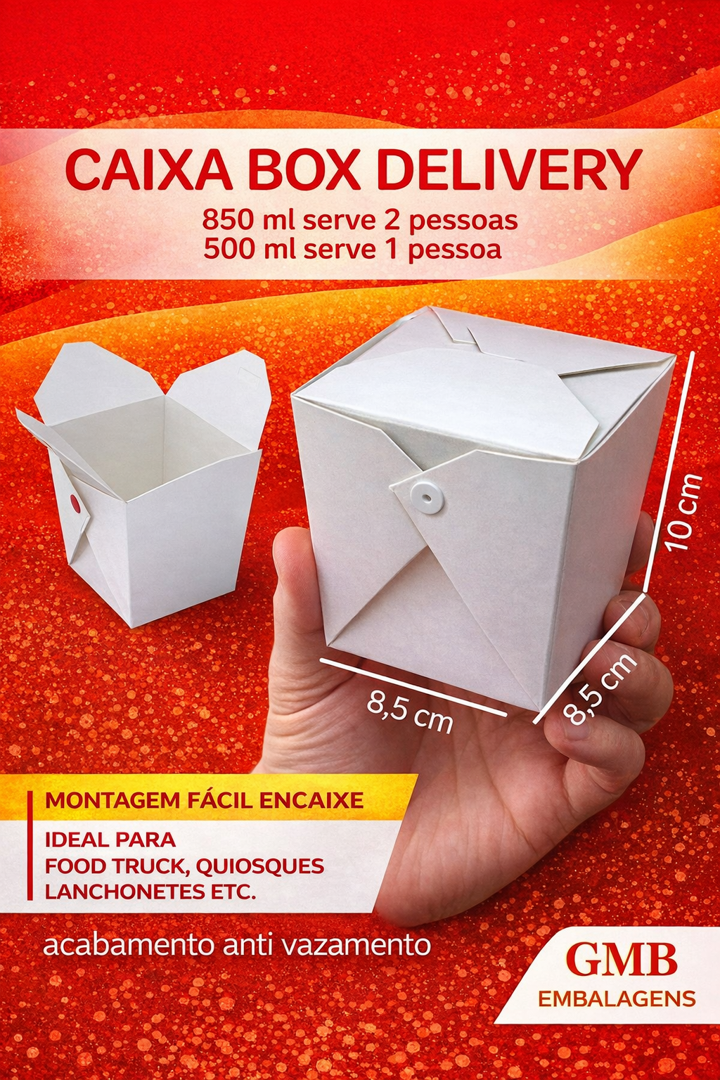 Caixa Box tamanho 850 ML Dimensões da Caixa 850 ml: 8,5 cm de comp. x 8,5 cm de larg. x 10 cm de alt. -Dimensões da Caixa 500 ml: 7,5 cm de comp. x 7,5 cm de larg. x 8 cm de alt. -Fechamento com botões plásticos: Acompanha o pedido -Papel: Cartão Extra Virgem 300 gramas -Acabamento: Plastificação dos 2 lados para maior resistência